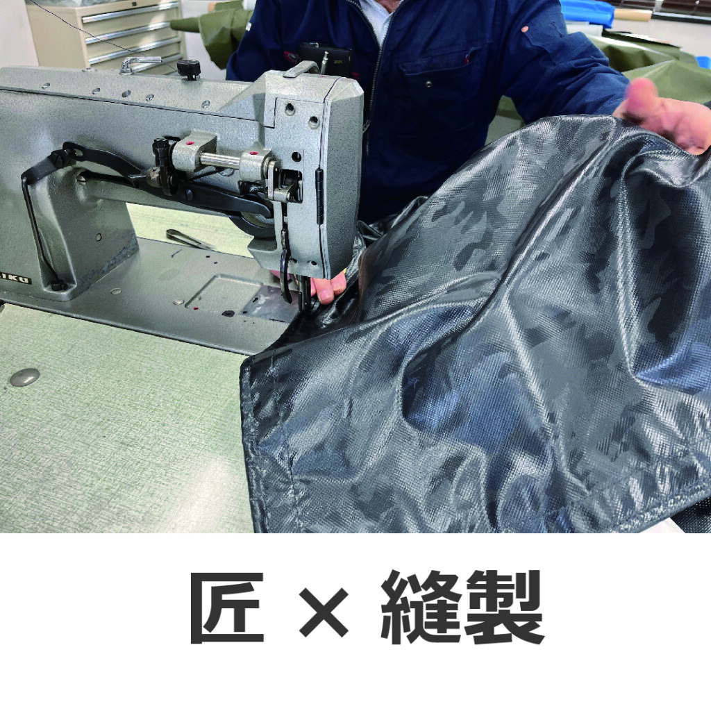 裁断、縫製、ハトメ打ちなど、多くの工程は人の手と経験に支えられています。